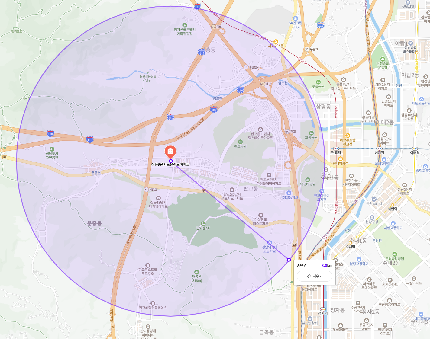 ※ 분당구청, 차병원, 성남시청 : 직선거리 4km 이상