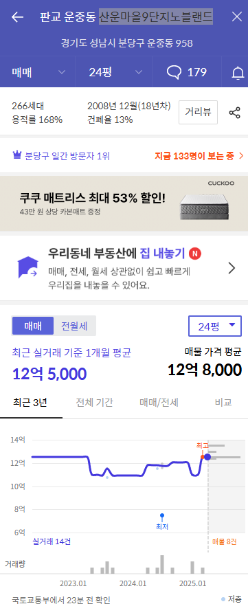24평형 최근 실거래 기준 1개월 평균 : 12.50억