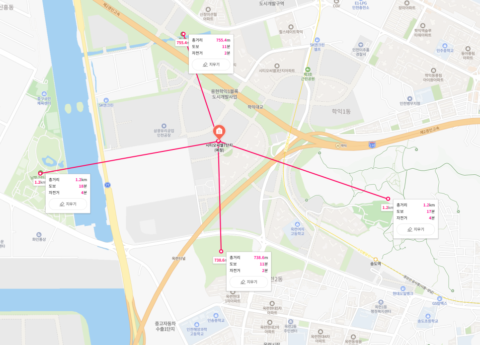 옥련공원 : 직선거리 738m