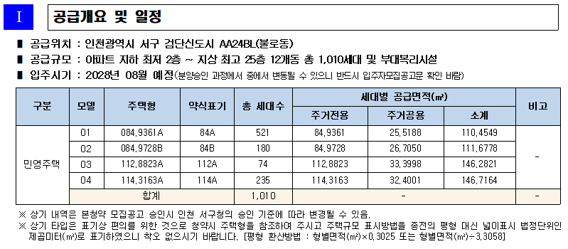 공급 내역입니다. 아파트 지하2층 - 지상 최고 25층, 12개동 총 1,010세대로